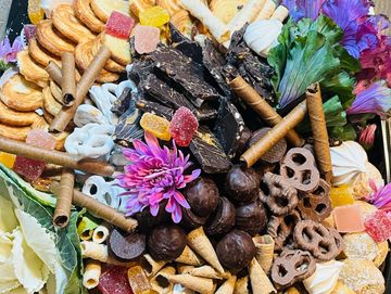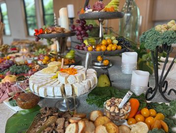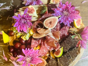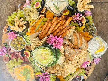 Customizable engraved wood platters. Artisanal cheese, cured meats, seasonal fruits, honeys and preserves with crackers, breads, nuts